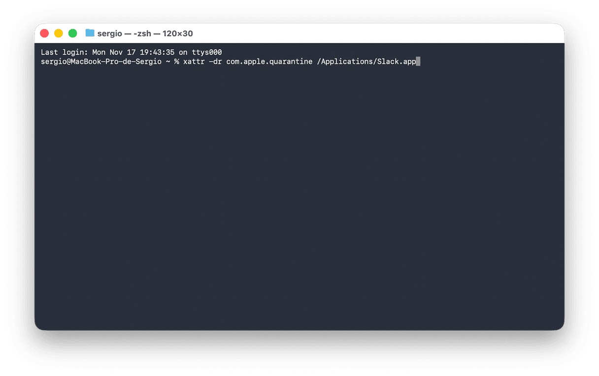xattr -dr com.apple.quarantine /Applications/AppName.app - Reinicia la app y comprueba si ha funcionado.