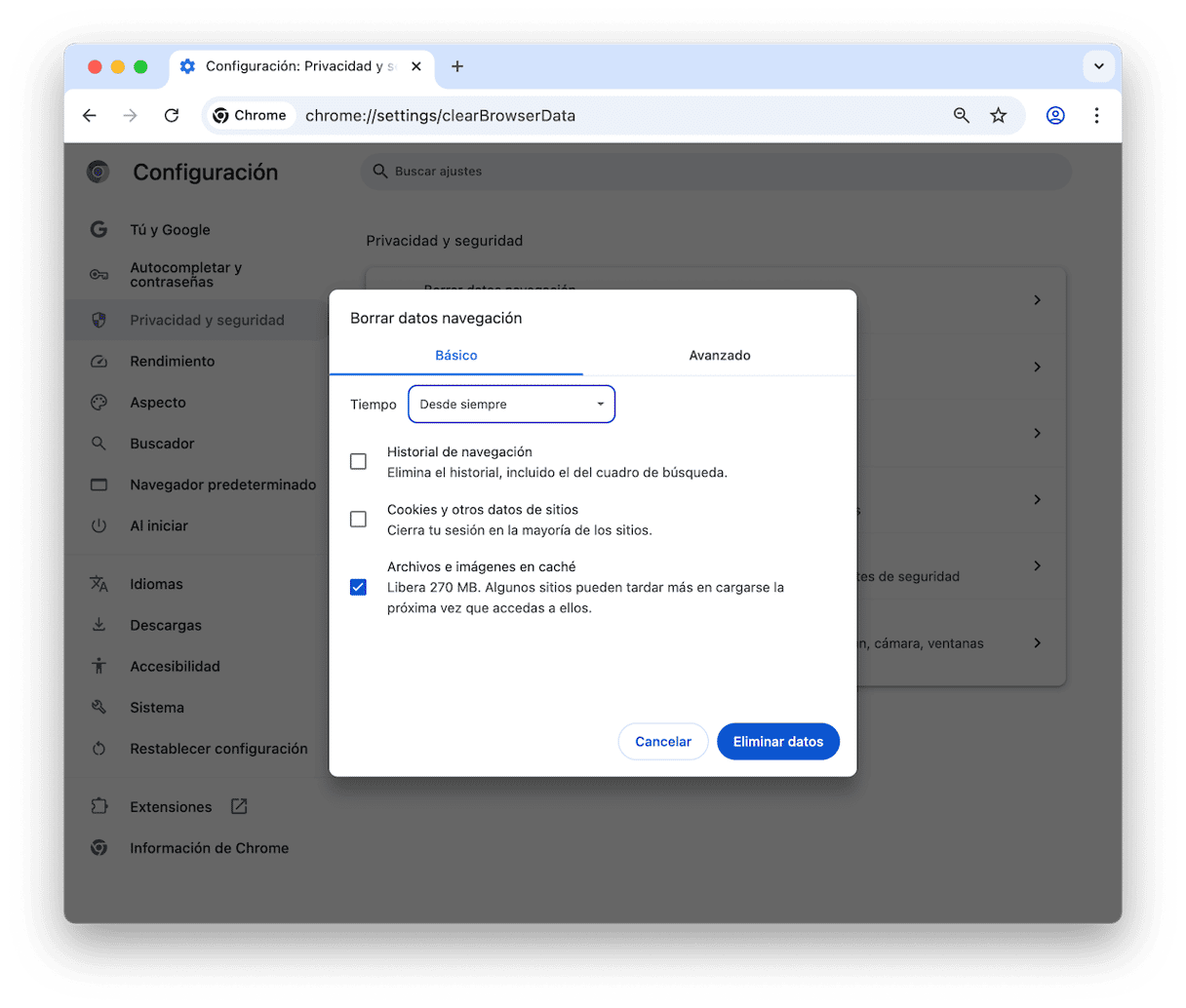 - No olvides seleccionar Archivos e imágenes en caché y haz clic en Eliminar datos.