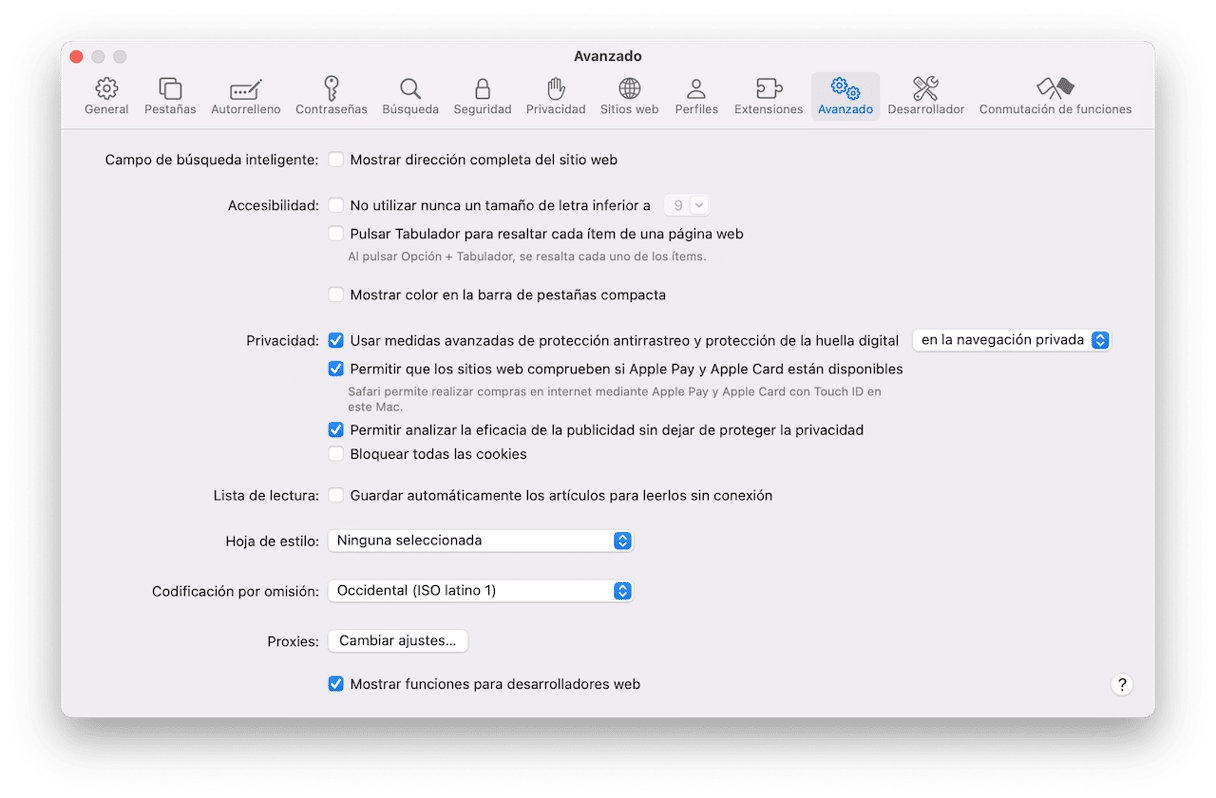 - En la pestaña Avanzado, marca Mostrar el menú Desarrollo en la barra de menús (Mostrar funciones para desarrolladores web en macOS Sequoia).