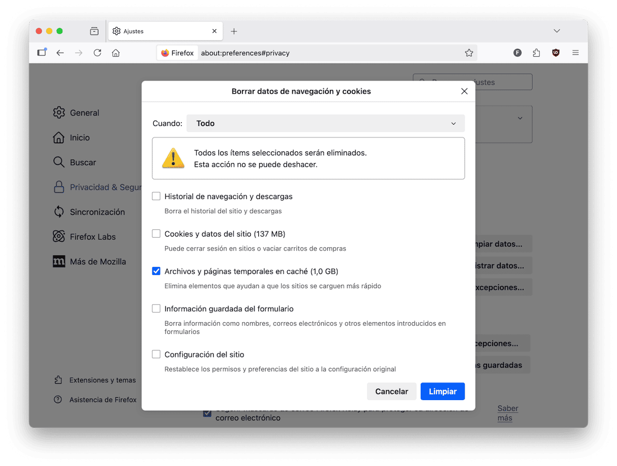 - Selecciona la casilla junto a Archivos y páginas temporales en caché y haz clic en Limpiar.