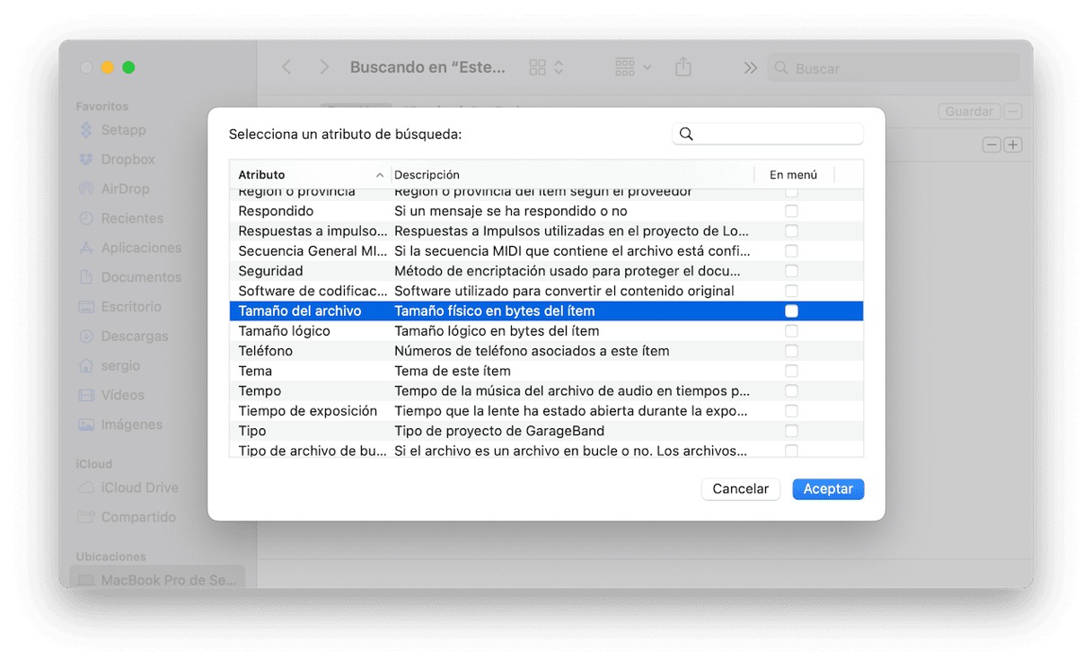 ¡Buen trabajo! Ahora puedes escribir las diferentes extensiones de archivo presionando el botón + y ordenar los resultados por el tamaño (ten en cuenta que tendrás que repetir los pasos explicados antes, pero tienes que elegir Extensión de archivo de la lista Otro…). Recomiendamos empezar por los archivos .DMG o los instaladores de aplicaciones. Son un peso muerto y puedes vivir perfectamente sin ellos. Y lo mismo vale para los archivos .ZIP.