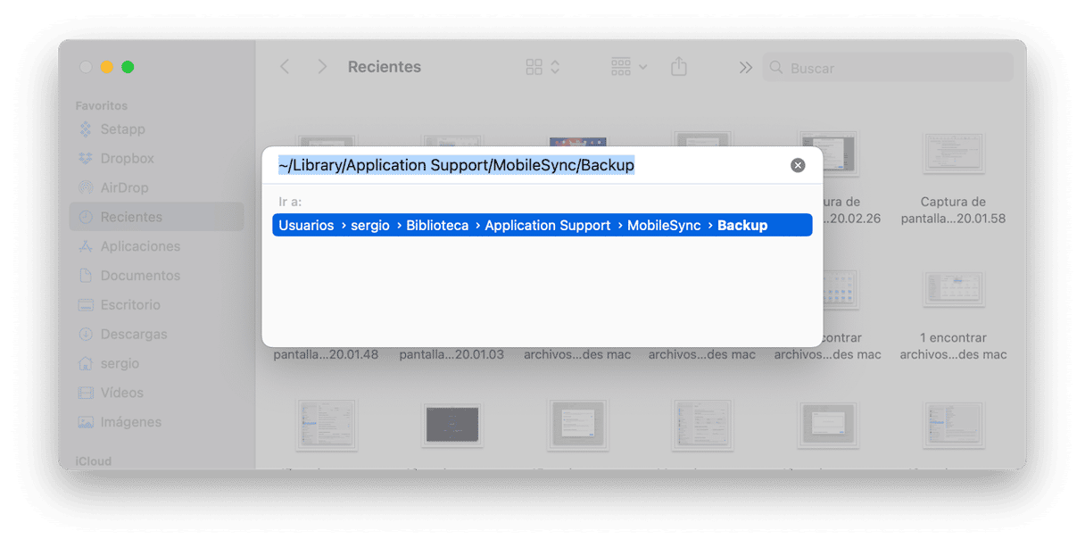 - Pega o escribe ~/Library/Application Support/MobileSync/Backup y presiona Intro.