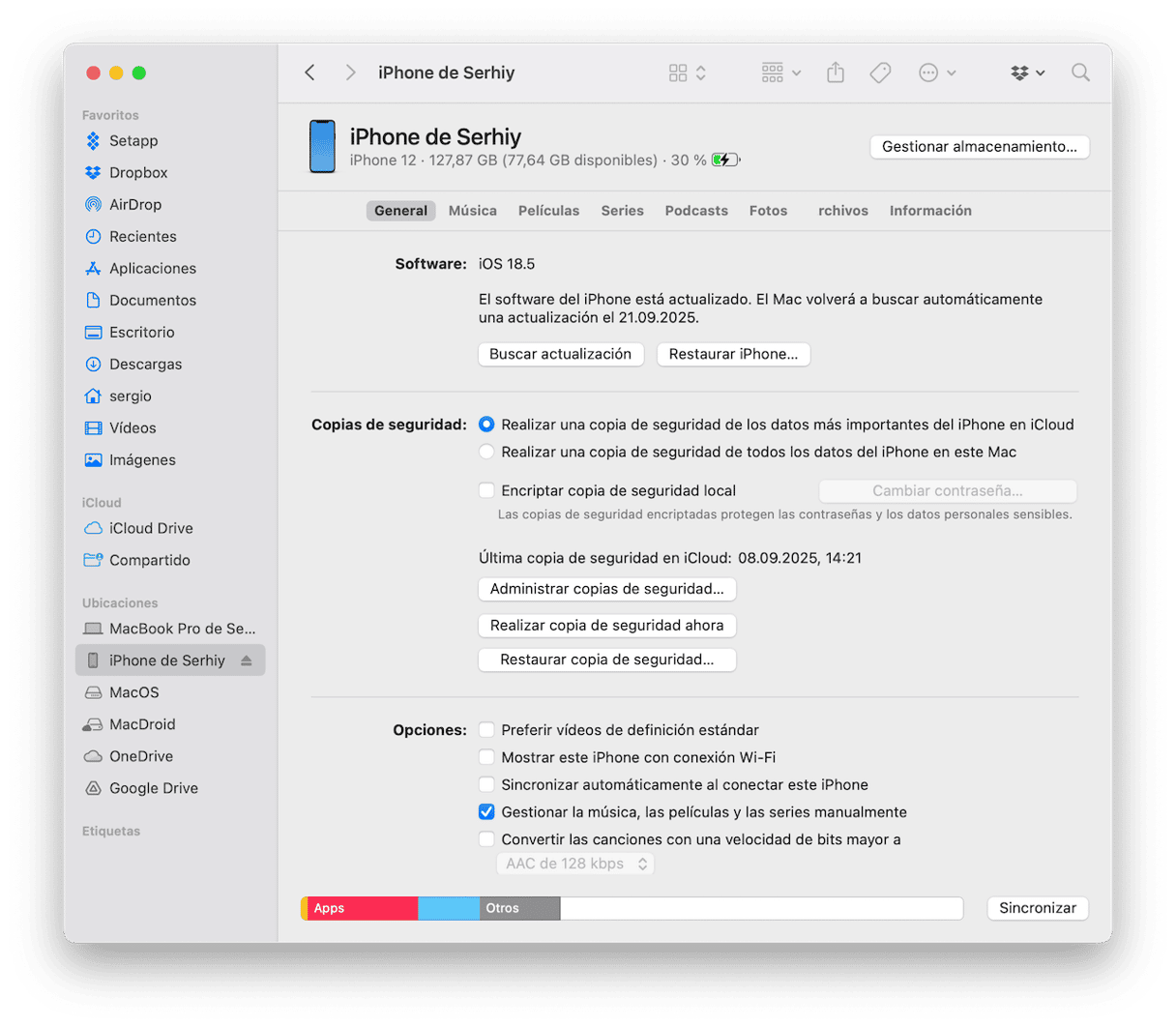 Suele ser la caché, archivos basura del sistema y copias de seguridad antiguas — si no los eliminas de manera regular, pueden llegar a ocupar hasta 40 GB de espacio.
