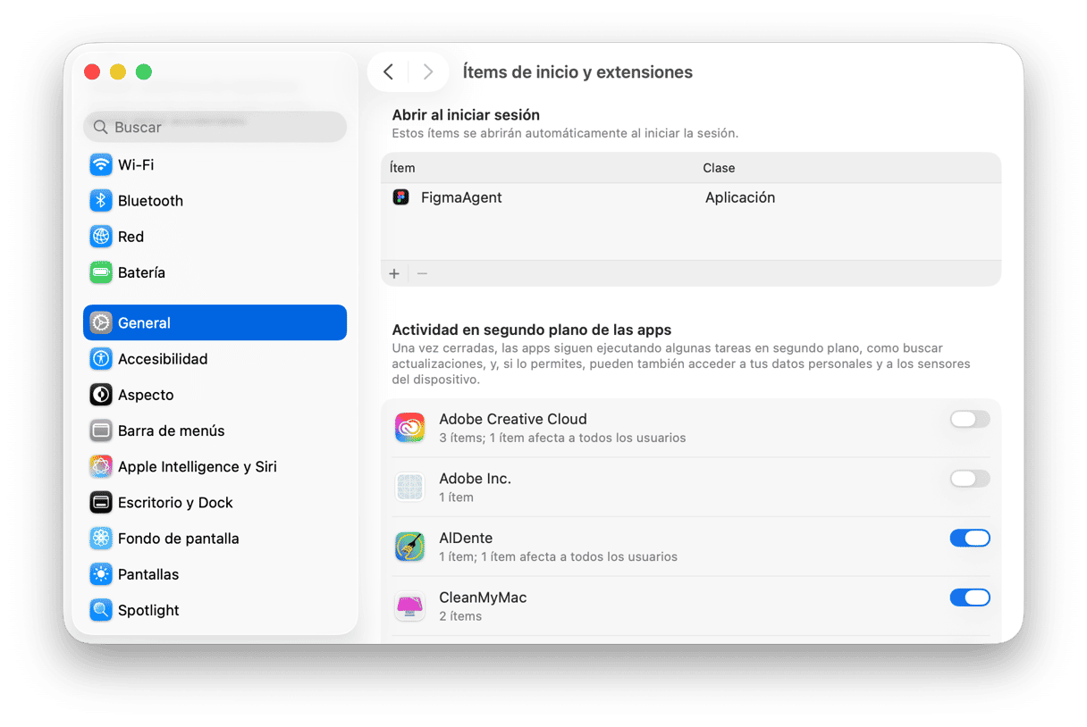 - Deshabilita los ítems de inicio en Ajustes del Sistema > General > Ítems de inicio y extensiones.