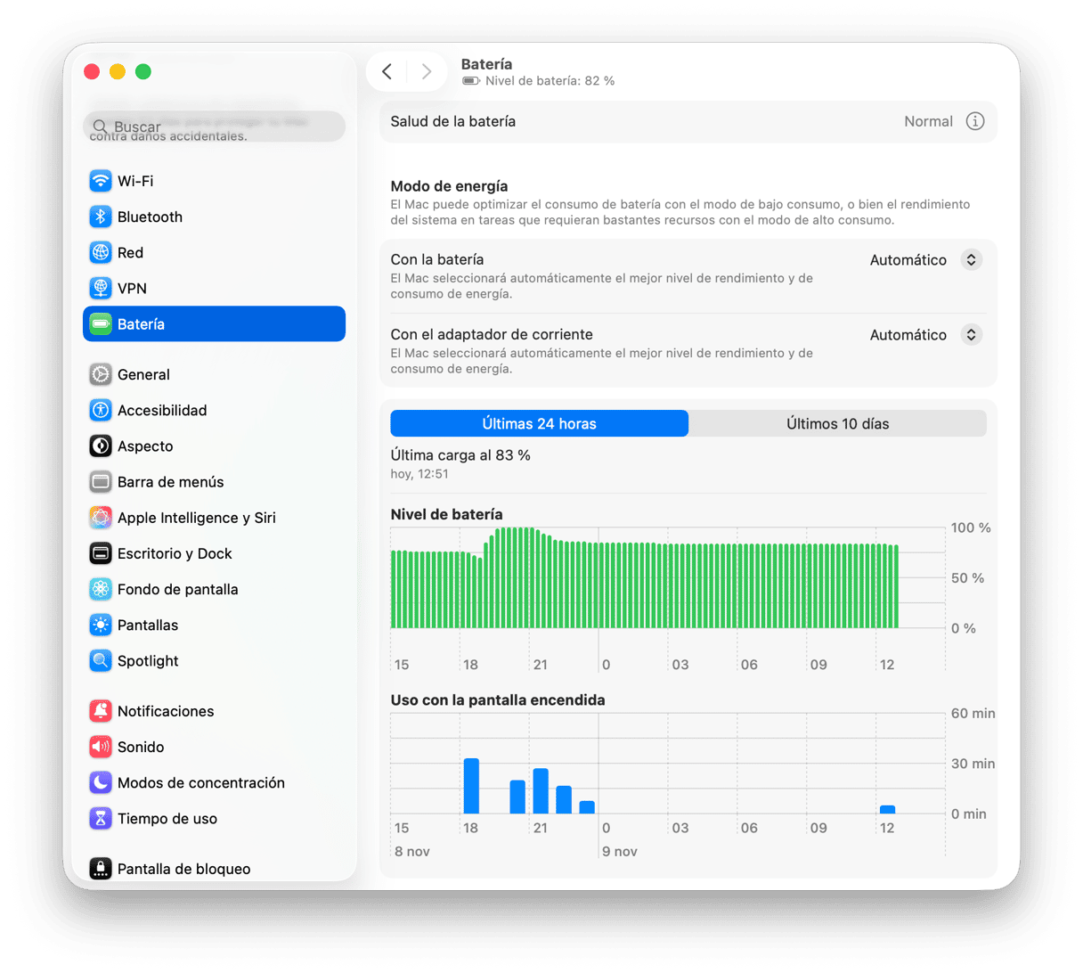 En esta pestaña puedes ver las apps que descargan mucho la batería. A diferencia de las otras pestañas, no muestra procesos. ¿En qué tienes que fijarte? En si pone "Sí" en la columna Impedir entrada en reposo — estas apps no dejan que tu Mac entre en modo reposo cuando cierras la tapa del portátil, por lo que pueden descargar la batería.