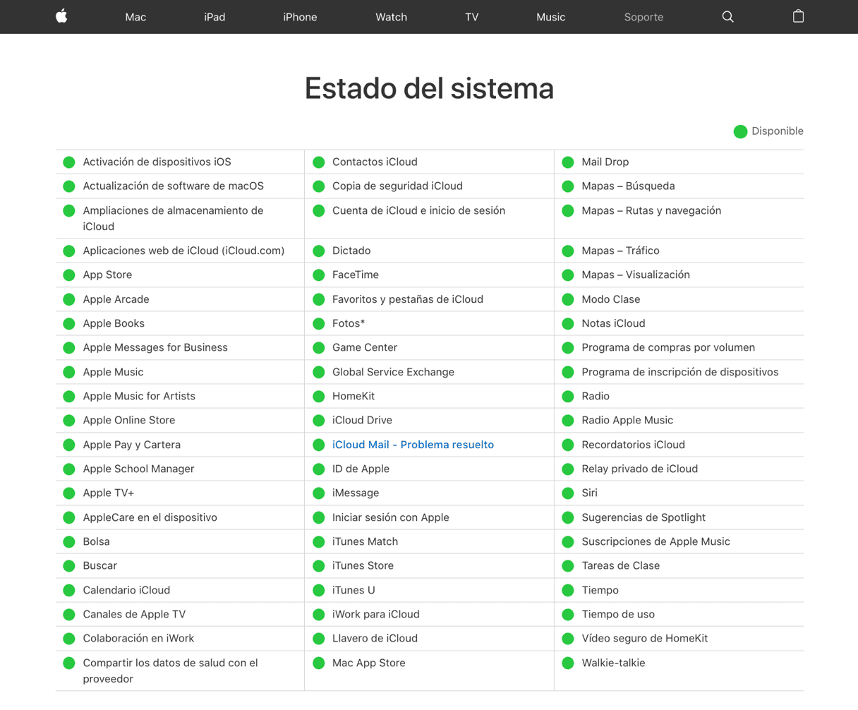 Apple tiene una página de estado en su sitio web que muestra todos sus servicios online y te informa si estos están en funcionamiento. Puedes verlo aquí.
