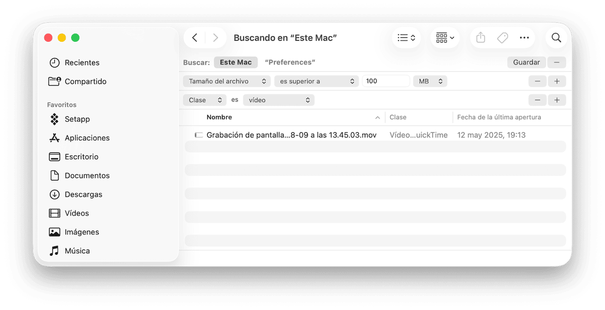 He usado los filtros de búsqueda integrados del Finder para encontrar los archivos multimedia grandes. Te muestro cómo puedes hacerlo: