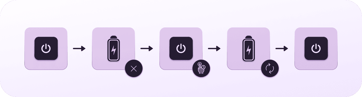 - Luego presiona el botón de encendido y mantén presionadas las cuatro teclas durante otros 7 segundos. Es posible que el Mac se encienda y apague durante el proceso.