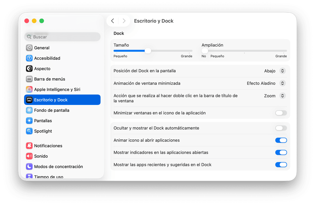 - Ve a Escritorio y Dock.