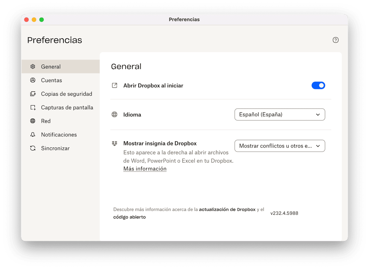 - Desactiva la opción "Abrir Dropbox al arrancar el sistema".