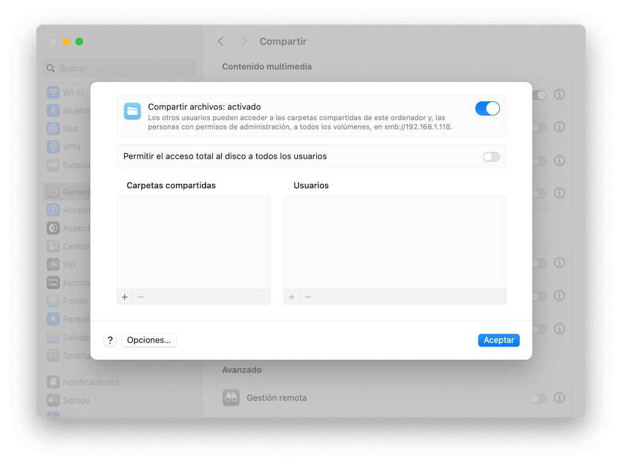 Si no te queda espacio de almacenamiento en la nube o iCloud no es una opción en tu caso, una excelente alternativa para transferir archivos entre tus Mac es compartirlos. Puedes compartir todo lo hay en tu sistema o seleccionar las carpetas específicas que quieres compartir.
