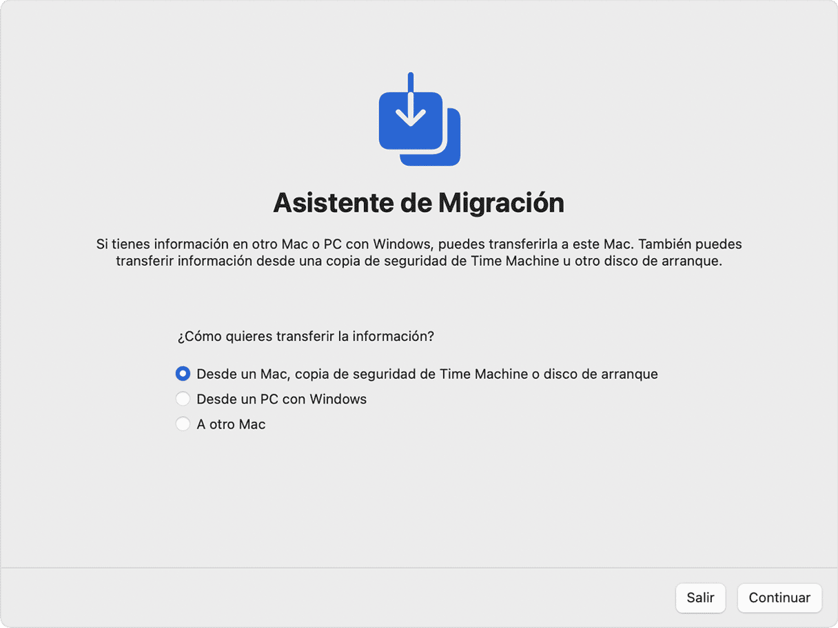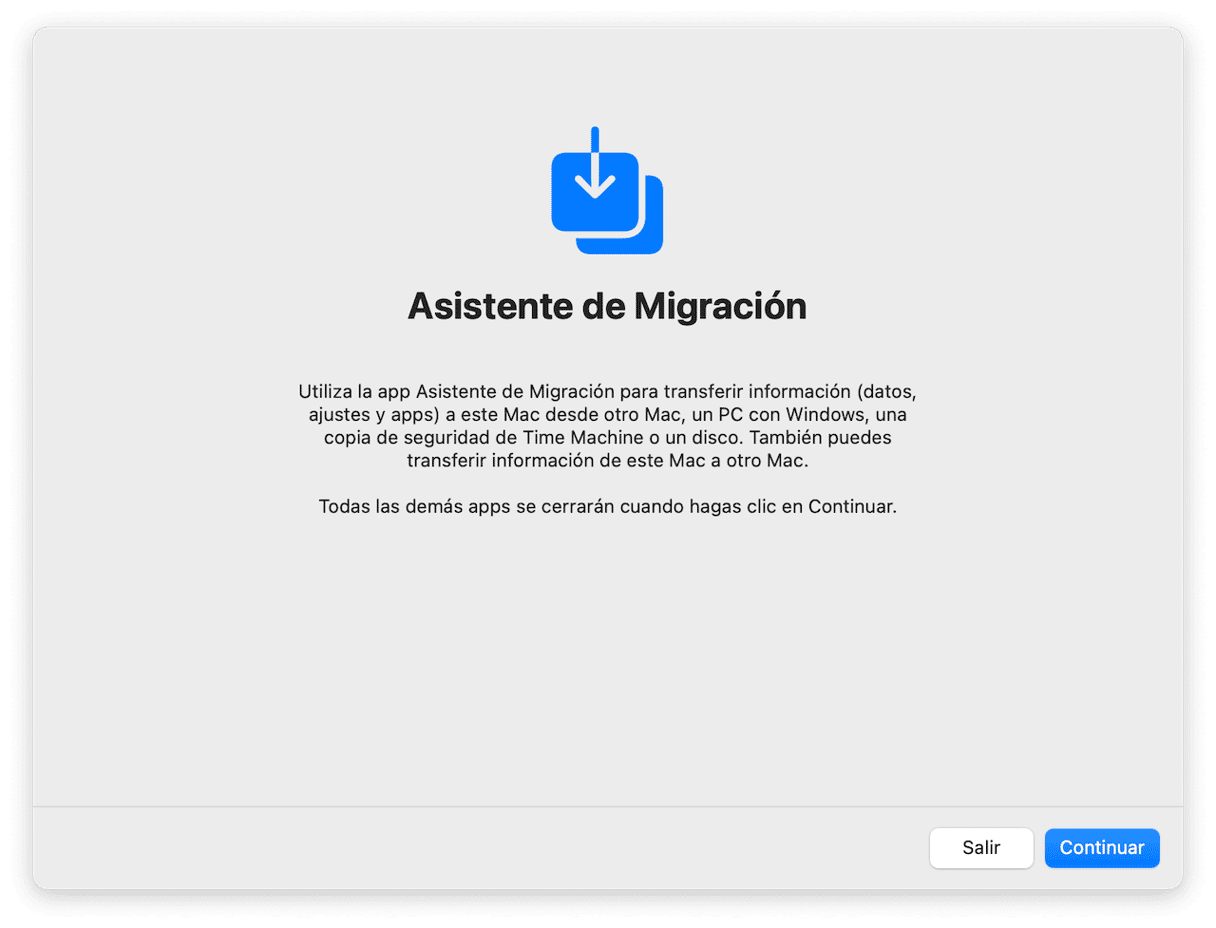 - Presiona Comando-Espacio, escribe Asistente de migración y ábrelo.