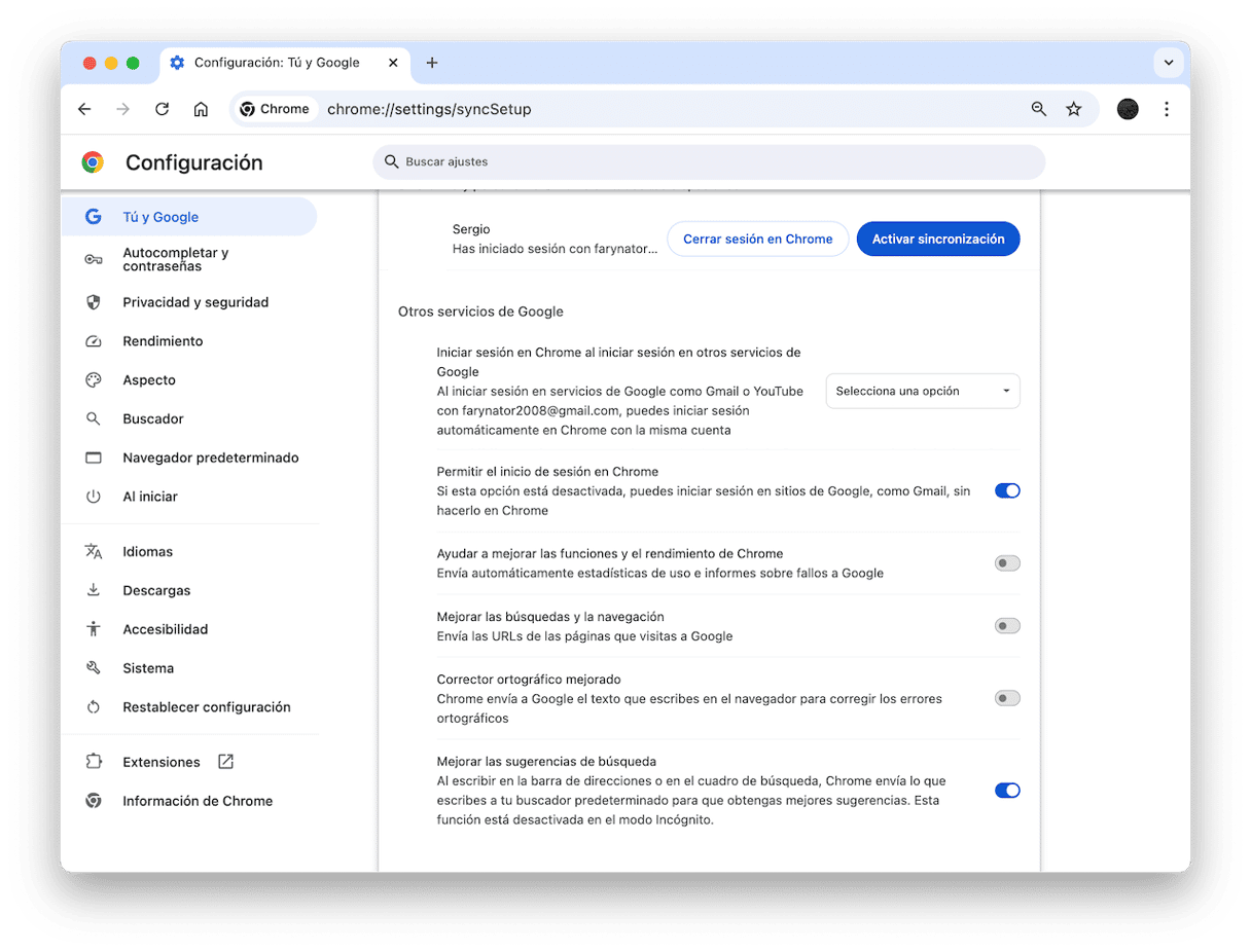 chrome://settings/ - Haz clic en Sincronización y servicios de Google.