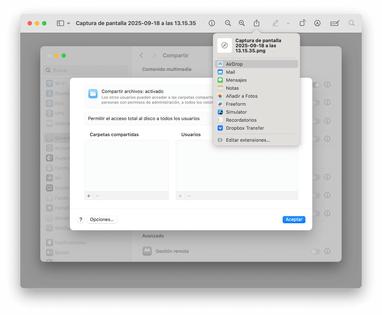 Ten en cuenta que AirDrop no deja sincronizar archivos. Es decir, cualquier cambio que hagas en un documento no será sincronizado automáticamente en otro Mac a menos que vuelvas a enviar la versión actualizada del documento.