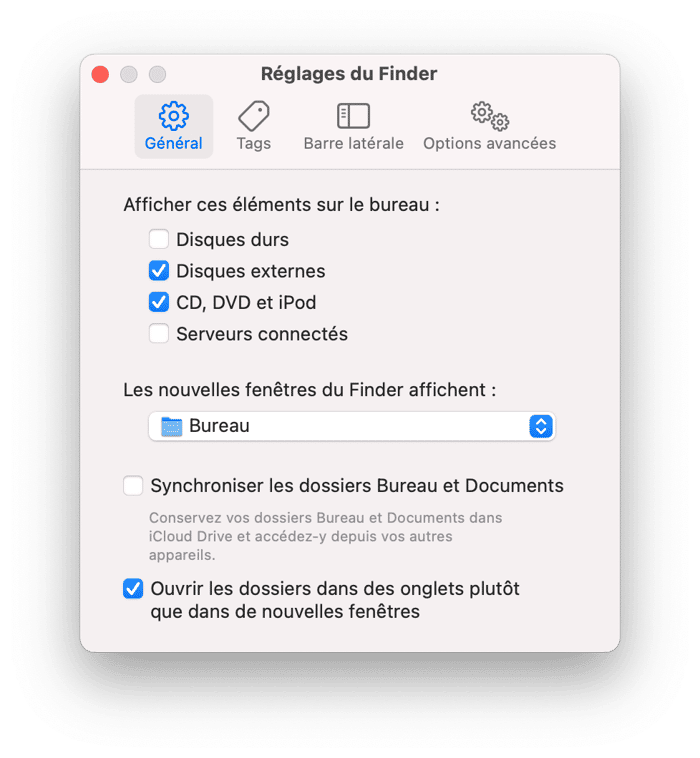 - Dans l'onglet Général, cochez les cases correspondant aux éléments que vous voulez voir sur votre bureau, comme les disques durs, les disques durs externes, etc.
