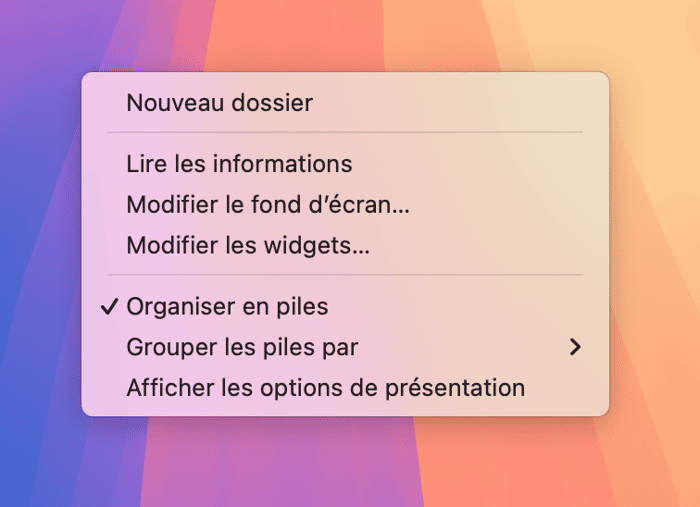 Les piles vous aident à organiser votre bureau en regroupant les fichiers similaires, mais elles peuvent parfois compliquer la tâche. En effet, il peut être difficile de retrouver certains fichiers quand vous ne pouvez pas les voir. Heureusement, vous pouvez facilement voir le contenu d'une pile en cliquant dessus. Mais pour désactiver les piles, faites un simple clic droit (ou Contrôle + clic) sur votre bureau, puis désélectionnez l'option Organiser en piles.