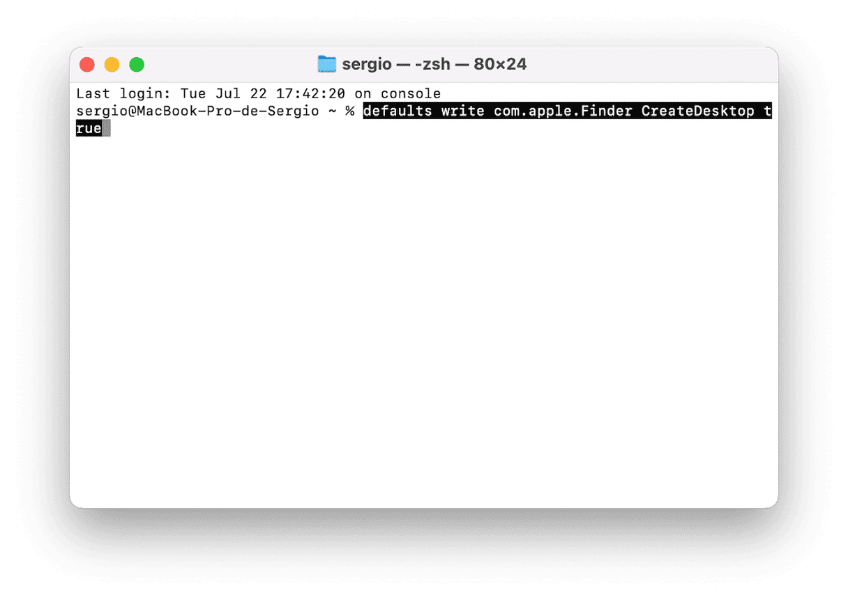 defaults write com.apple.Finder CreateDesktop true - Saisissez ensuite