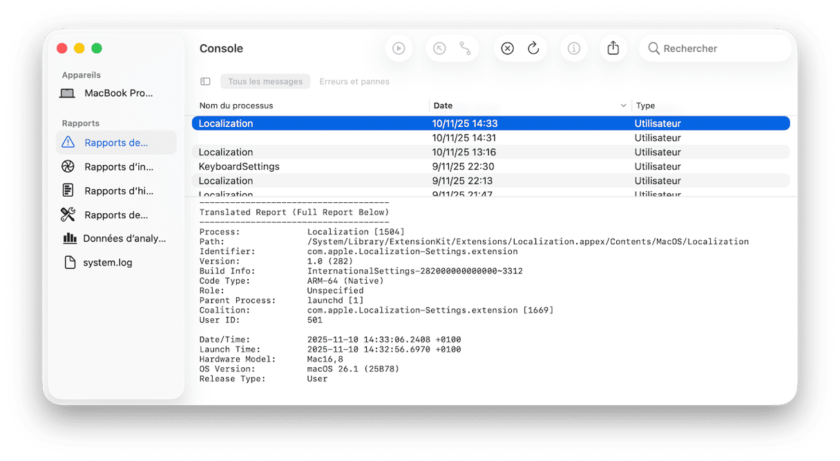 - Ouvrez le Finder > Applications > Utilitaires > Console.