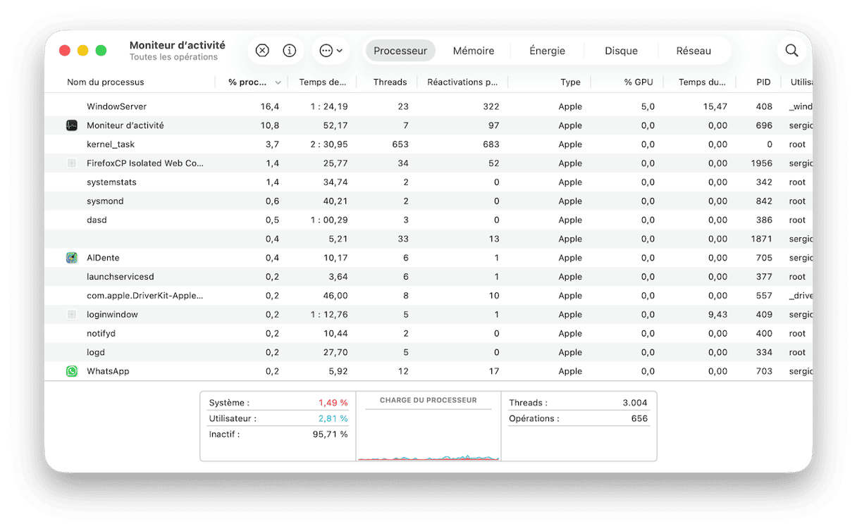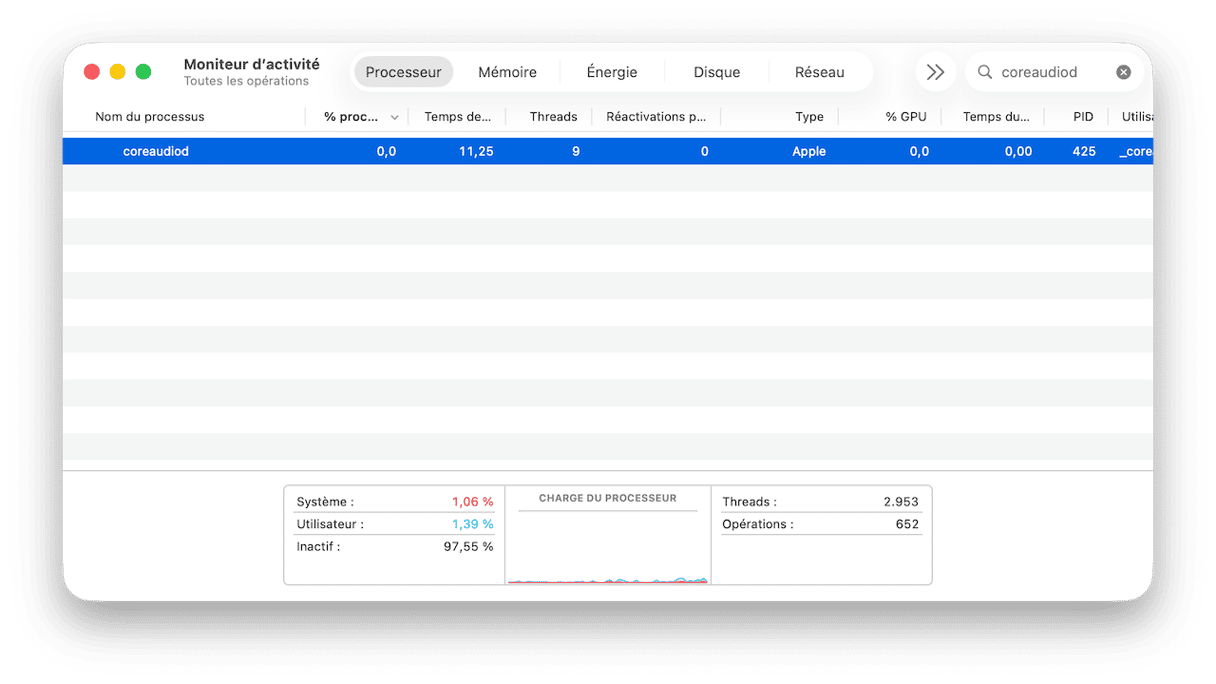 Rendez-vous dans Applications > Utilitaires, puis ouvrez le Moniteur d'activité. Cliquez sur l'onglet Processeur. Vous devriez voir une liste des processus en cours, organisés en fonction du pourcentage de cycles processeur qu'ils utilisent. Si coreaudiod utilise beaucoup de ressources processeur, il apparaîtra en haut de la liste.