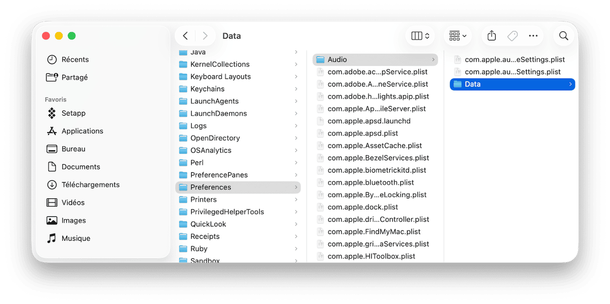 Ouvrez le Finder, puis dans la barre des menus, cliquez sur Aller > Aller au dossier. Dans le champ de texte, collez le chemin d'accès suivant, puis appuyez sur Entrée : /Library/Preferences/Audio/. Si le Finder ouvre un dossier appelé Audio, c'est que tout fonctionne normalement.