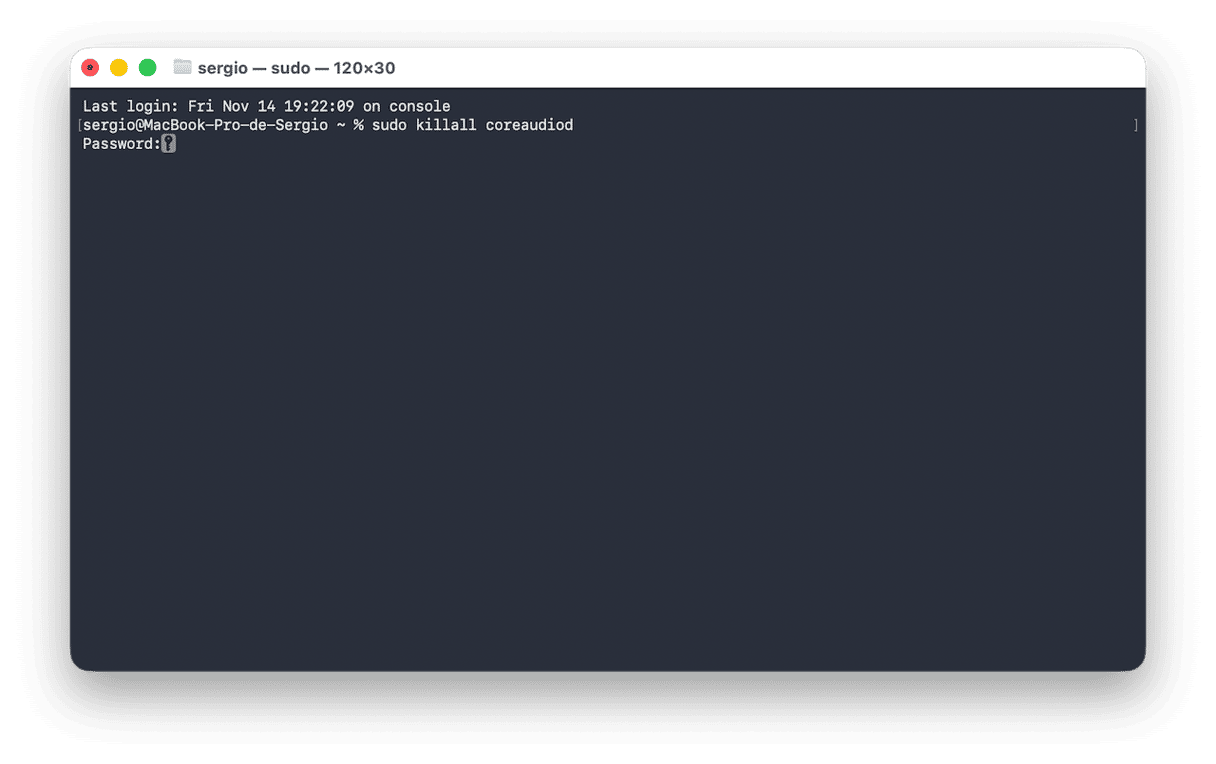 sudo killall coreaudiod - Fermez ensuite le Terminal.