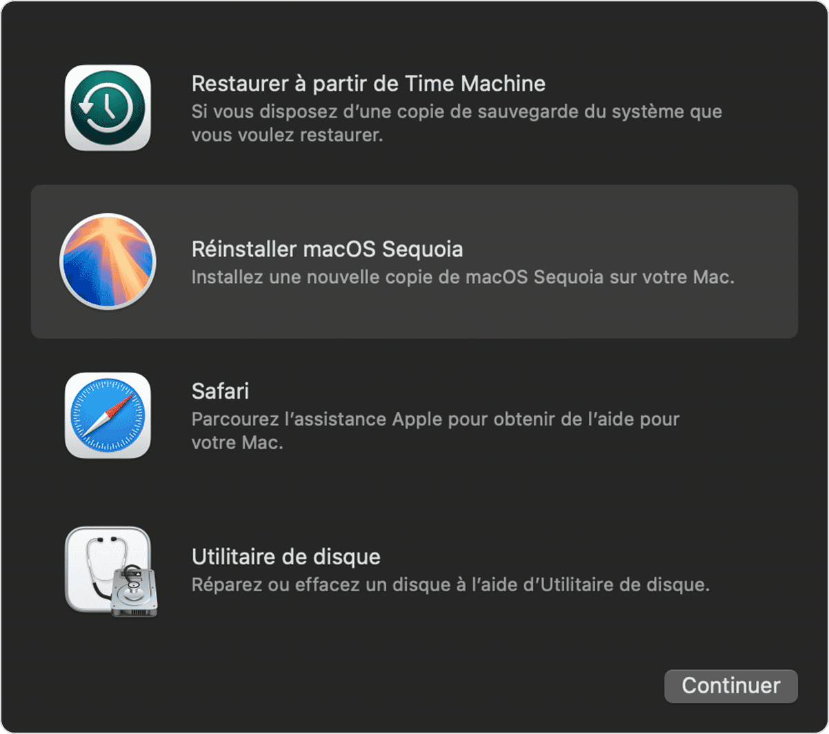 Une fois que vous avez redémarré en mode récupération, choisissez l'option Réinstaller macOS, et suivez les instructions qui s'affichent à l'écran.
