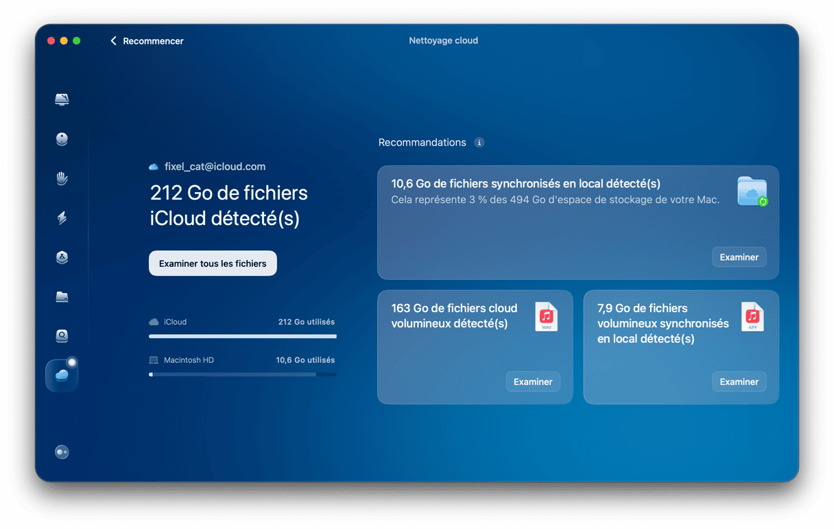 Vous pouvez acheter davantage de stockage, mais voyez d'abord s'il est possible de libérer de l'espace en faisant le tri dans vos données iCloud. L'outil Nettoyage cloud de CleanMyMac se connecte à votre compte iCloud Drive et vous aide à identifier les fichiers volumineux ou redondants qui prennent le plus de place. Commencez simplement votre essai gratuit de CleanMyMac pour essayer cette fonctionnalité.Vous pourrez alors analyser, examiner et nettoyer votre stockage iCloud, ce qui pourrait vous permettre d'économiser sur l'achat d'espace supplémentaire.