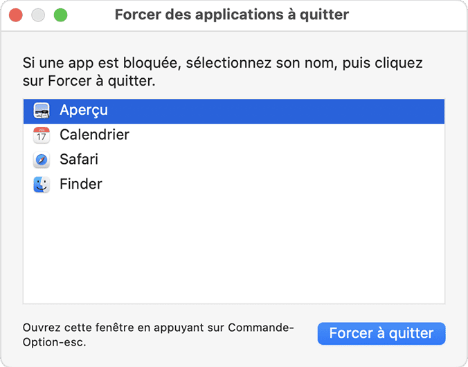 Il est possible d'éviter les plantages de votre Mac en forçant la fermeture des applications qui ne répondent pas : utilisez le raccourci Alt + Command + Esc pour ouvrir le menu Forcer à quitter. Sélectionnez celles que vous souhaitez fermer et cliquez sur le bouton Forcer à quitter.