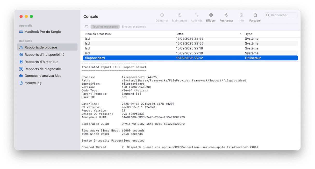 Vous pouvez également retrouver tous les rapports dans l'utilitaire Console. Allez dans le Finder > Applications > Utilitaires > Console. Ouvrez la Console et cliquez sur Rapports de blocage dans le menu latéral gauche.