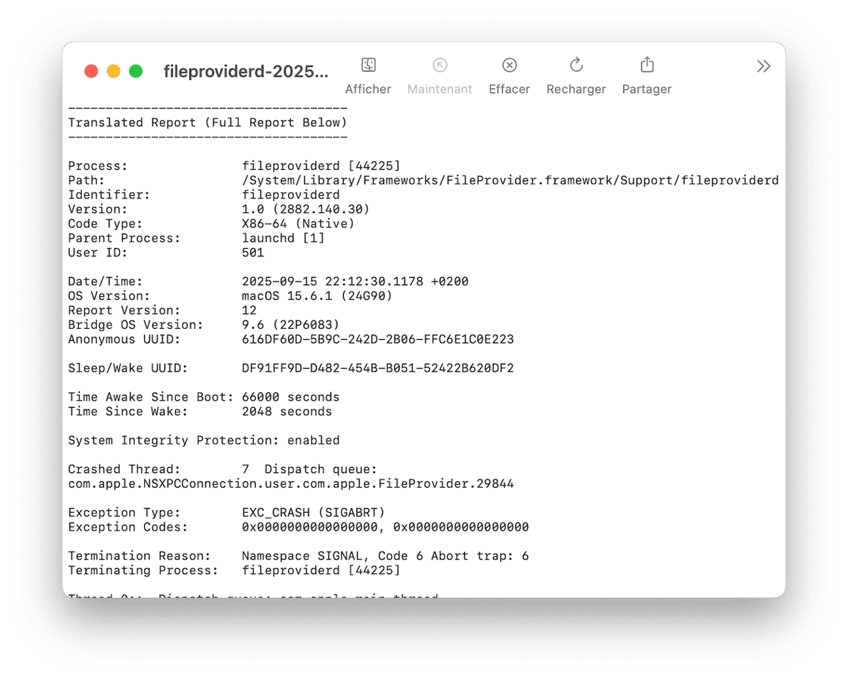 Les fichiers de blocage se terminent par l'extension « .ips » et la date du plantage est indiquée dans leur nom. Ouvrez le rapport. Voici les principales informations qu'il contient :