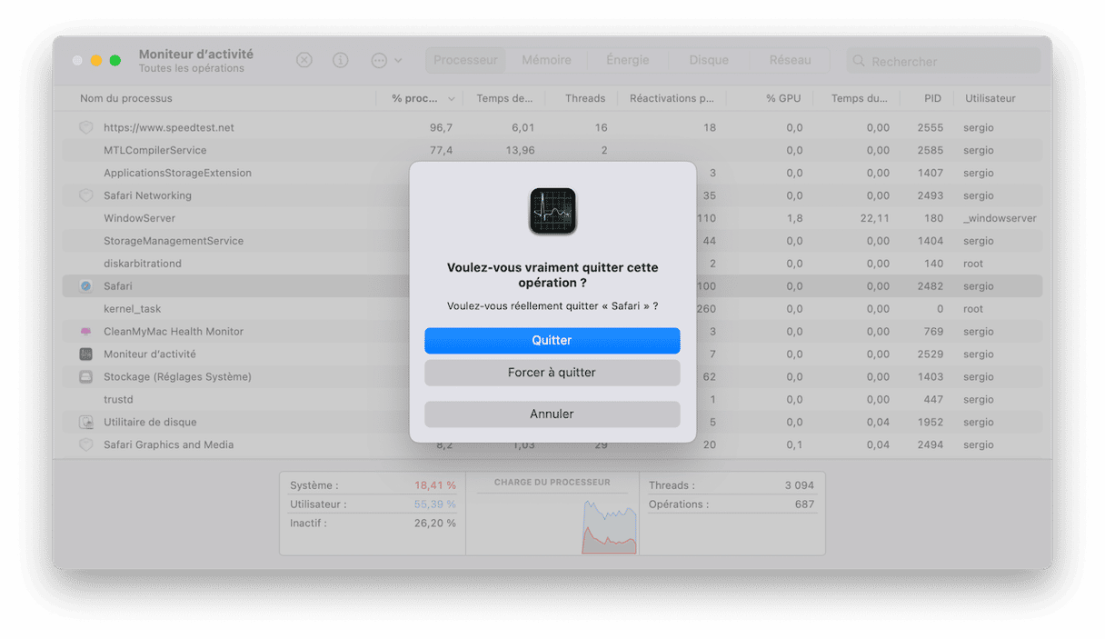 - Quittez les applications gourmandes en ressources (celles qui utilisent trop de mémoire et de ressources processeur) via le Moniteur d'activité. Sélectionnez simplement la ou les applications qui monopolisent vos ressources, et cliquez sur X dans la barre d'outils > Quitter.