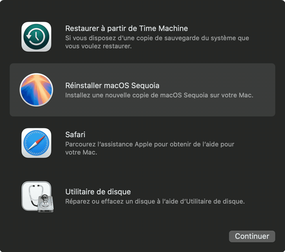 - Rendez-vous dans Utilitaires macOS > Réinstaller macOS > Continuer. Installez les applications dont vous aurez besoin.
