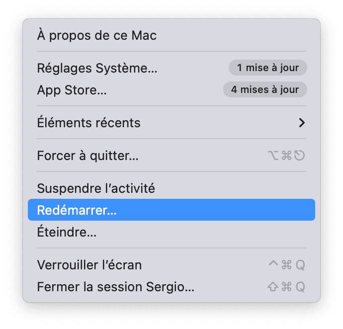 Redémarrer votre Mac permet de supprimer les fichiers temporaires et, sur les modèles les plus récents, d'effectuer quelques vérifications sur votre disque de démarrage. C'est souvent une bonne façon de résoudre un problème dont la cause est inconnue.