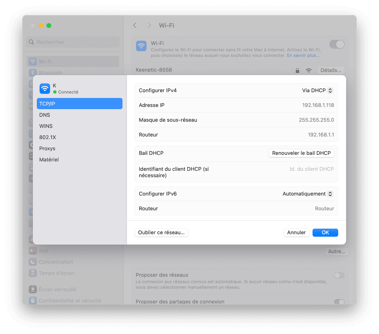 - À côté de votre réseau Wi-Fi, cliquez sur Détails puis rendez-vous dans la section TCP/IP.