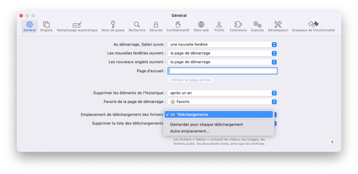 - Safari : Réglages > Général (à côté d'Emplacement de téléchargement des fichiers)