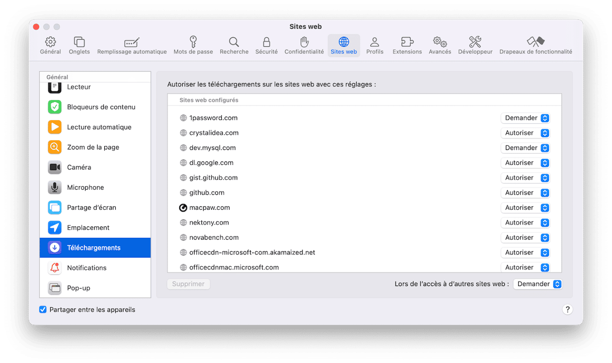 - Safari : rendez-vous dans Réglages > Sites web > Téléchargements et regardez quels sont les sites web autorisés