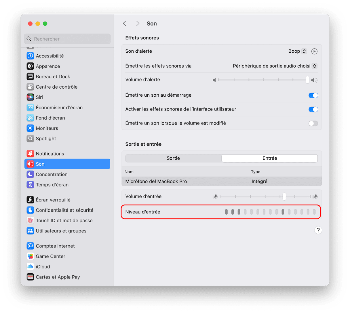 - Si vous parlez près de votre Mac, l'indicateur de niveau d'entrée devrait bouger.