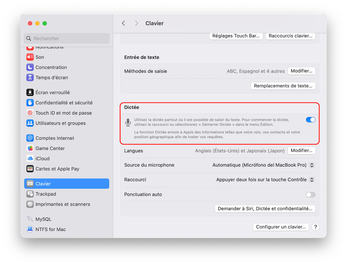 - Dans la section Dictée, activez la dictée : cela devrait télécharger des fichiers qui feront fonctionner votre micro.