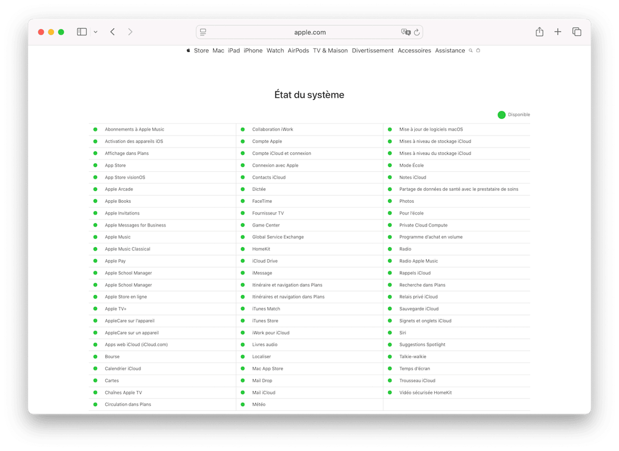 Sur son site, Apple dispose d'une page d'état listant tous ses services en ligne et indiquant, à l'aide d'un point vert ou rouge, s'ils fonctionnent normalement. Vous pouvez y accéder ici.