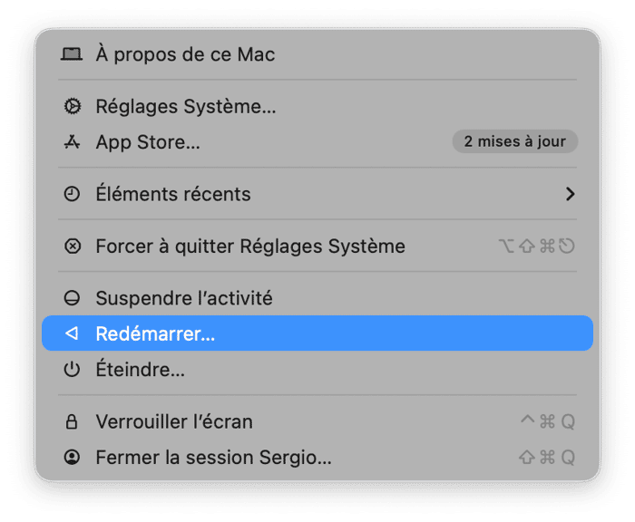 Eh oui, cette bonne vieille astuce fonctionne toujours. Dès que vous avez besoin de faire de la place, un petit redémarrage peut vous aider. Rendez-vous dans le menu Apple et cliquez sur Redémarrer.