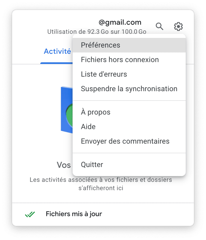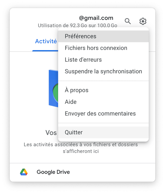 Cliquez sur l'icône de Google Drive dans la barre des menus (en haut à droite). Si vous ne trouvez pas l'icône dans votre barre des menus, ouvrez l'application Google Drive depuis le dossier Applications.