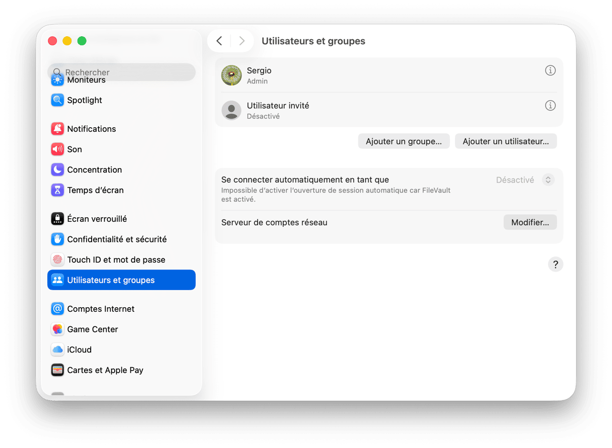 - Consultez les profils installés dans Réglages Système > Utilisateurs et groupes. Cliquez sur le « i » à côté de l'utilisateur connecté, et assurez-vous que l'option Autoriser cet utilisateur à administrer cet ordinateur soit activée. Vous devrez peut-être ajouter un compte si celui que vous utilisez ne dispose pas des autorisations d'administration.