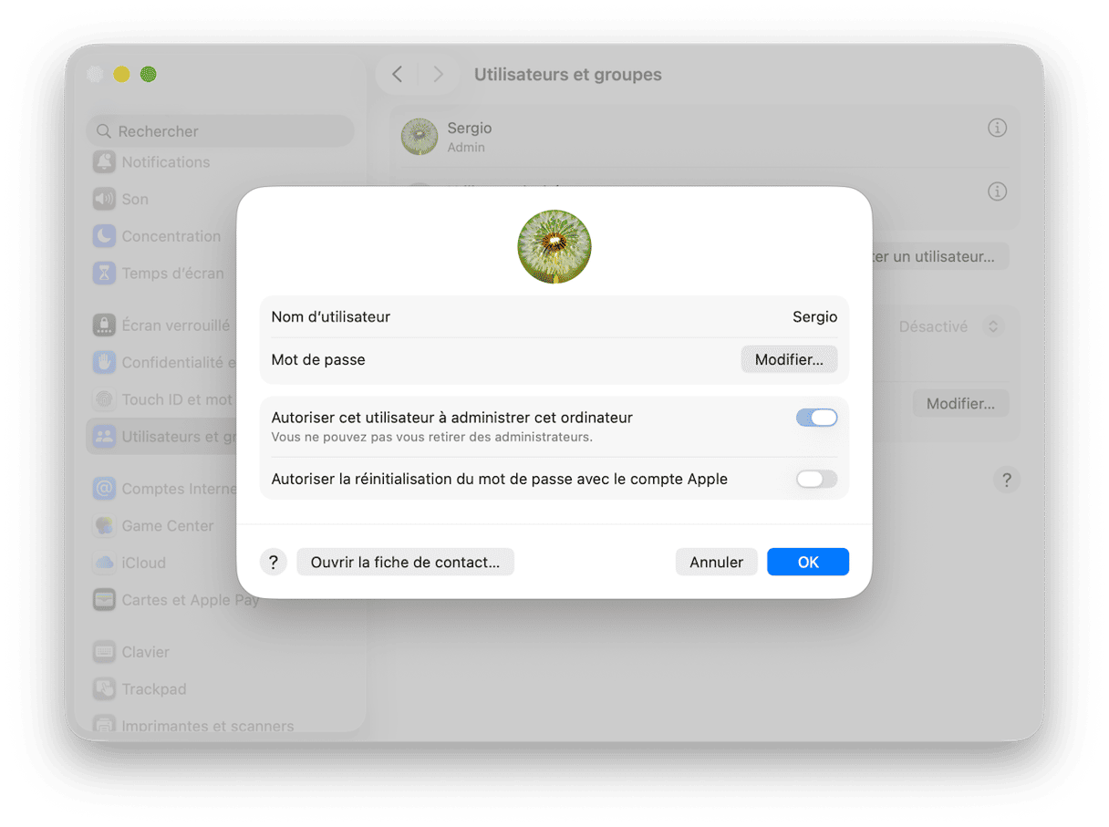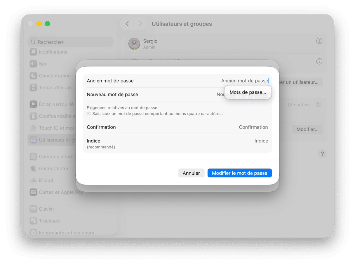 Si vous partagez votre Mac avec quelqu'un d'autre et que cette personne a son propre compte, vous pouvez vous en servir pour réinitialiser votre mot de passe. Ou si vous avez vous-même un autre compte sur votre Mac dont vous connaissez le mot de passe, vous pouvez récupérer le mot de passe de votre compte administrateur en suivant ces étapes :