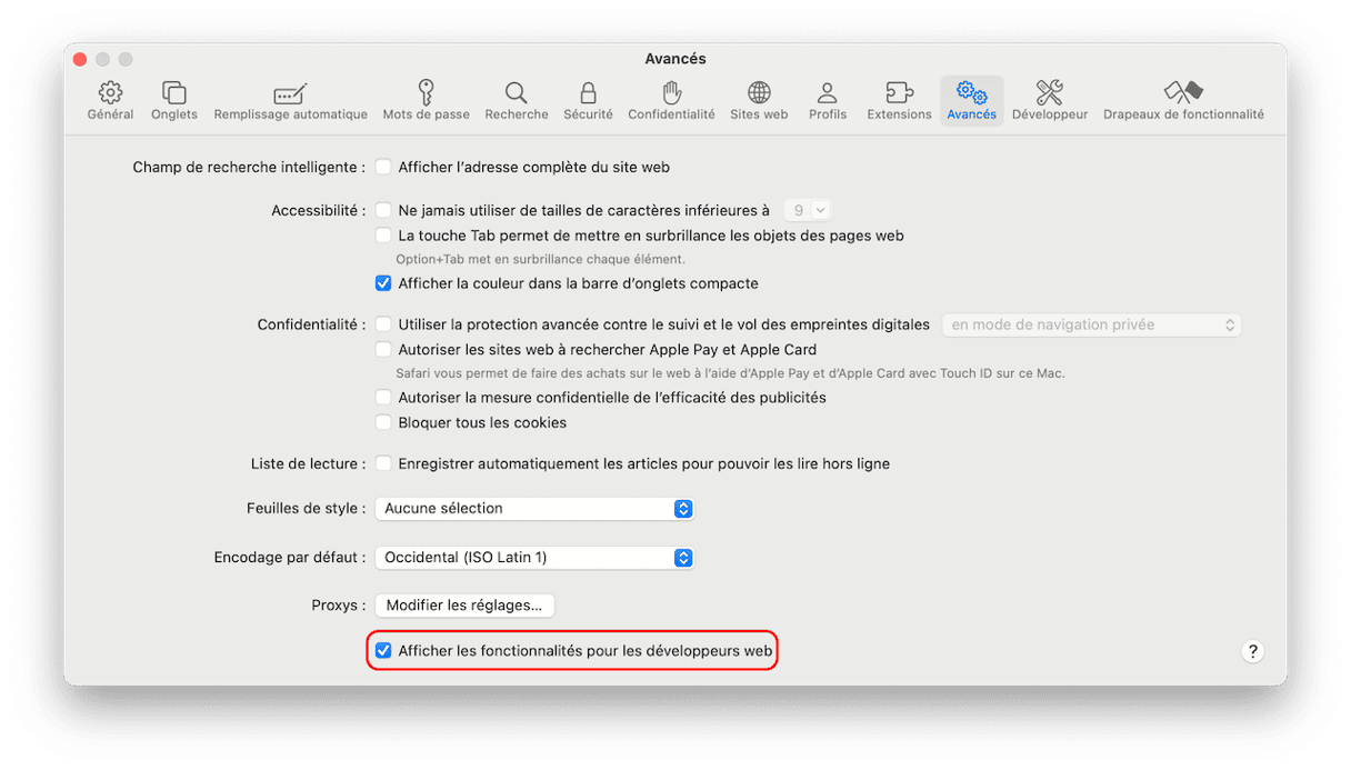 - En bas de la fenêtre, vous devriez voir une case à cocher intitulée "Afficher le menu Développement dans la barre des menus" ; cochez-la.