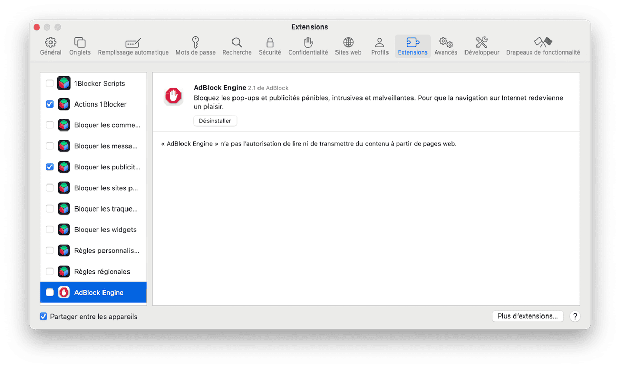 - Dans la fenêtre qui s'ouvre, vous verrez une liste des extensions installées. Pour réinitialiser entièrement Safari, cliquez sur chacune des extensions une à une, puis sur Désinstaller.