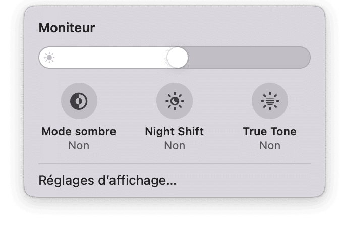 Autre option : cliquez sur l'icône du Centre de contrôle dans la barre des menus > Moniteurs, et désactivez l'option True Tone. Voyez si le problème a disparu.