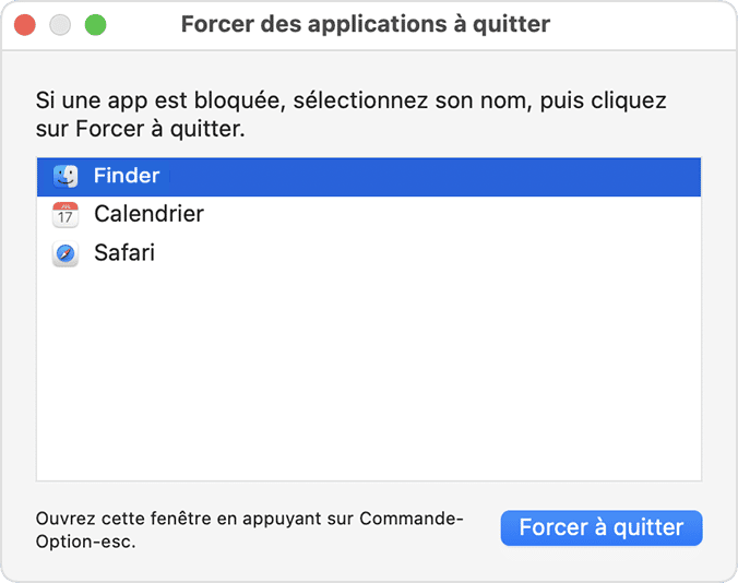 - Cliquez sur Forcer à quitter (ou utilisez le raccourci Command + Alt + Esc).