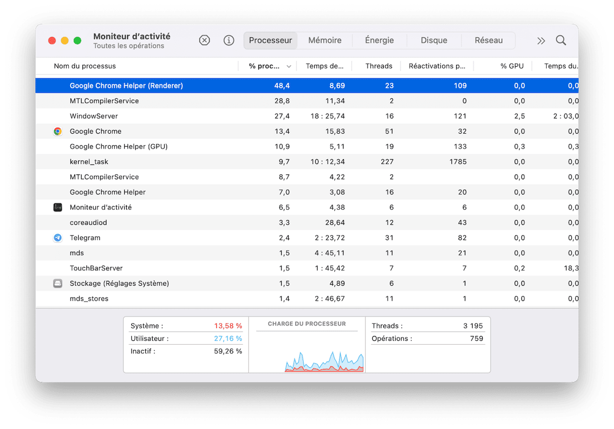 Si la roue multicolore s'affiche, c'est peut-être parce que votre Mac commence à se faire vieux. Vous pouvez voir si c'est le cas en vérifiant l'utilisation du processeur. Pour cela, rendez-vous dans le Moniteur d'activité. Vous le trouverez dans le dossier Applications/Utilitaires ou via une recherche Spotlight.