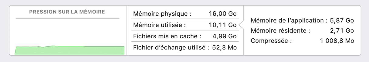 Autre problème matériel à envisager : vous n'avez pas assez de RAM, ou mémoire à accès aléatoire non volatile (Random Access Memory en anglais). Pour voir si vous avez besoin de plus de RAM, ouvrez à nouveau le Moniteur d'activité depuis le dossier Applications/Utilitaires. Dans l'onglet Mémoire se trouvent des données de pression sur la mémoire, illustrées par un graphique. S'il est rouge et que votre mémoire est constamment mise à l'épreuve par différentes applications exécutées en même temps, vous avez trouvé le problème.