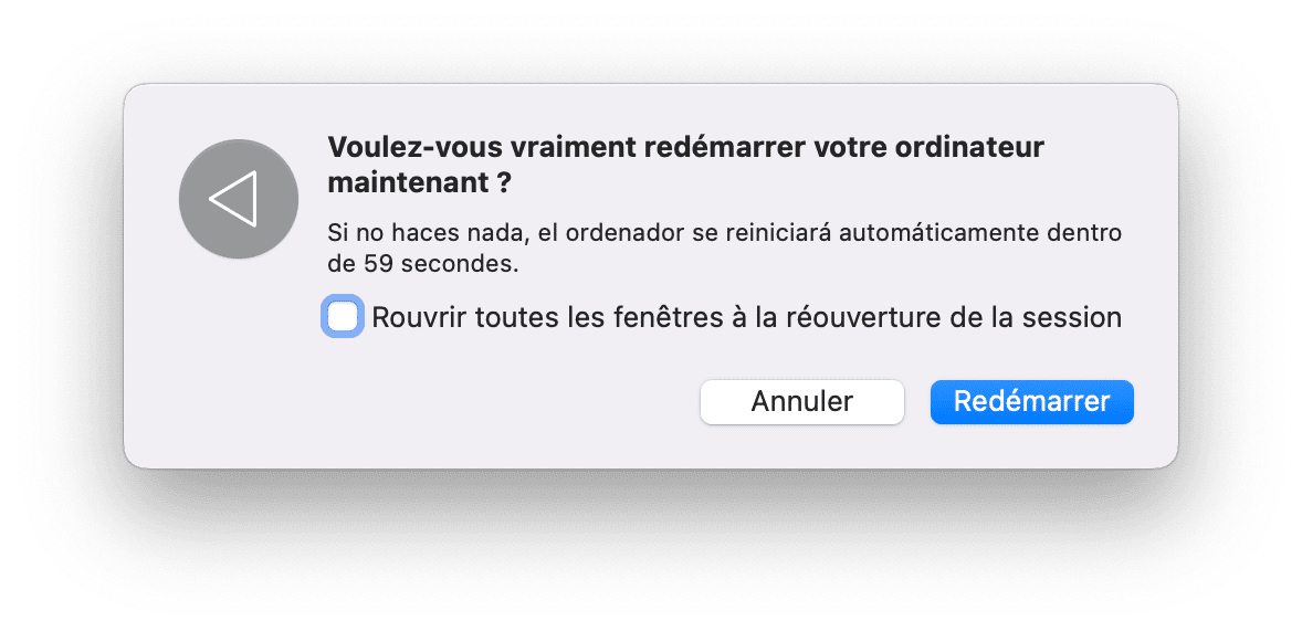 Cliquez simplement sur Redémarrer depuis le menu Apple. Assurez-vous de décocher l'option Rouvrir toutes les fenêtres à la réouverture de la session.